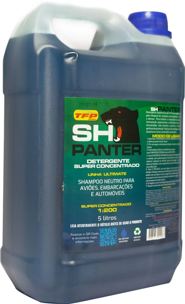 Detergente Automotivo de pH neutro, desenvolvido para limpeza de veículos automotores, marítimos e aéreos. Para facilitar a remoção da sujeira, sua formulação potencializa a flotação das sujeiras incrustadas, não mancha a pintura e deixa uma película de proteção. Pela sua tecnologia, não retira da pintura as ceras e proteção existentes. Com 1 litro do SH Panter você consegue fazer até 200 litros de solução do produto.